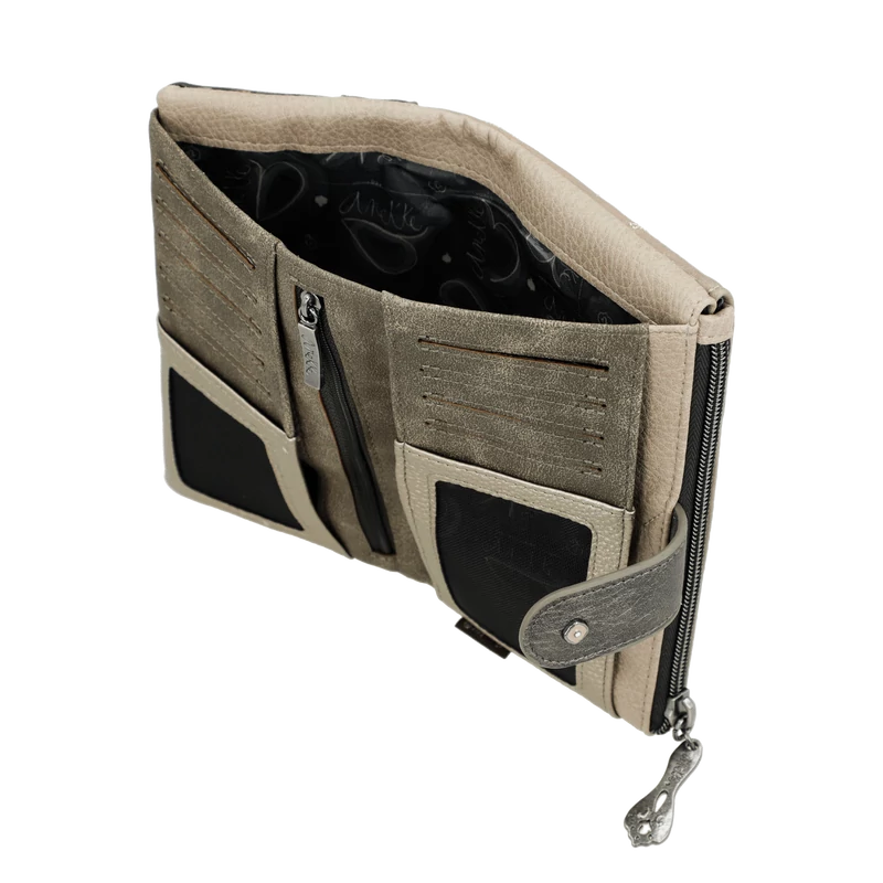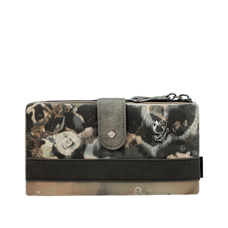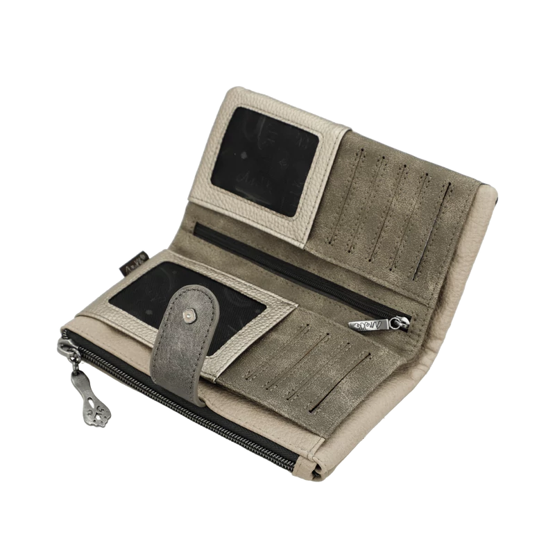 Esta é uma carteira de tamanho grande. Possui dois compartimentos principais: um na parte de trás, onde encontrará uma carteira grande e espaço para notas, cartões ou documentos e outro na parte superior que possui um fecho de correr, e no interior pode armazenar moedas. Todo o interior é forrado. Características: