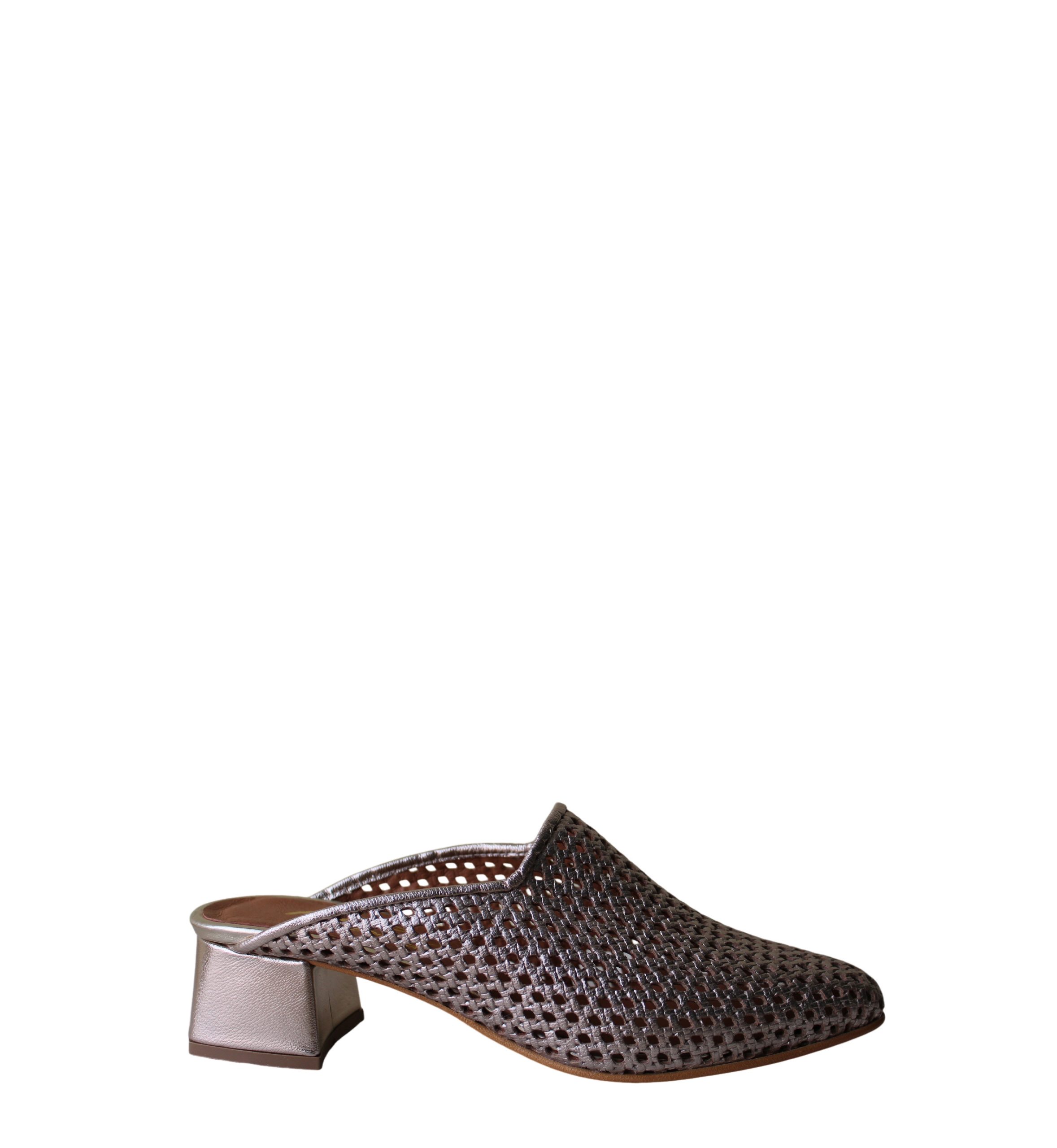 Descrição : Fabricado em Portugal .Mule Andrya em pele gravada e perfurada. Biqueira pontiaguda. Salto de 4,5 cm forrado a pele