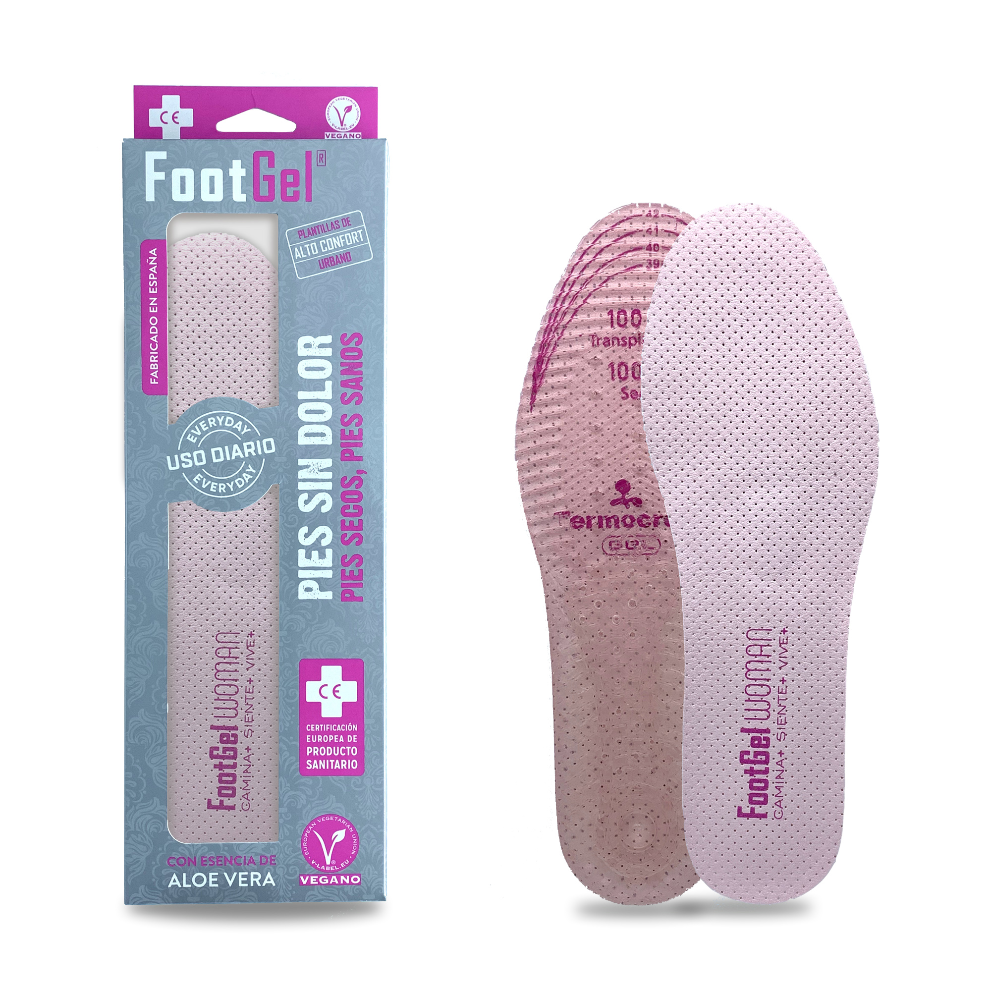 Palmilhas da marca Foot Gel, aromatizadas com fragância de aloe vera Palmilha com 2 camadas, a primeira camada conta com um tecido antibacteriano, antialérgico e 100% respirável e a segunda camada possui a tecnologia Termocrep-Gel. Possui aroma de Aloe Vera. reduzem a pressão nas articulações. Com exclusivo sistema respiratório, tecido respirável antimicrobiano e termorregulador. Estas palmilhas de gel incorporam um design de amortecimento máximo patenteado para aliviar a cadeia de impactos, desde os pés, joelhos, quadril, lombar e cervical. Númeração fixada na palmilha para recortar pela medida é referente ao tamanho europeu;Recomenda-se recortar um número a mais para sua comprovação inicial até seu encaixe perfeito;Fabricado na Espanha. Termocrep-Gel® Laváveis Transpiráveis