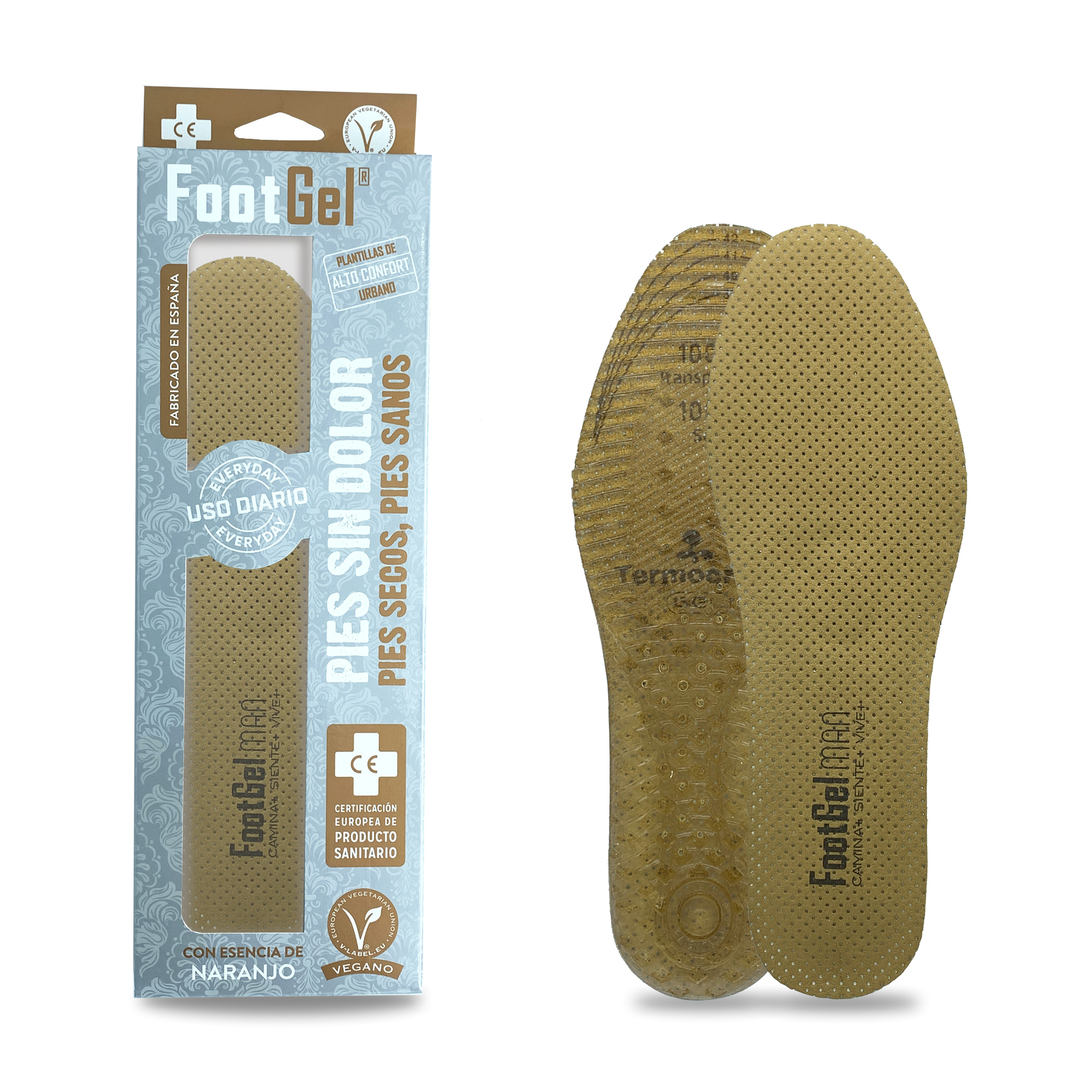 Palmilhas da marca Foot Gel, aromatizadas com fragância de aloe vera Palmilha com 2 camadas, a primeira camada conta com um tecido antibacteriano, antialérgico e 100% respirável e a segunda camada possui a tecnologia Termocrep-Gel. Possui aroma de Aloe Vera. reduzem a pressão nas articulações. Com exclusivo sistema respiratório, tecido respirável antimicrobiano e termorregulador. Estas palmilhas de gel incorporam um design de amortecimento máximo patenteado para aliviar a cadeia de impactos, desde os pés, joelhos, quadril, lombar e cervical. Númeração fixada na palmilha para recortar pela medida é referente ao tamanho europeu;Recomenda-se recortar um número a mais para sua comprovação inicial até seu encaixe perfeito;Fabricado na Espanha. Termocrep-Gel® Laváveis Transpiráveis
