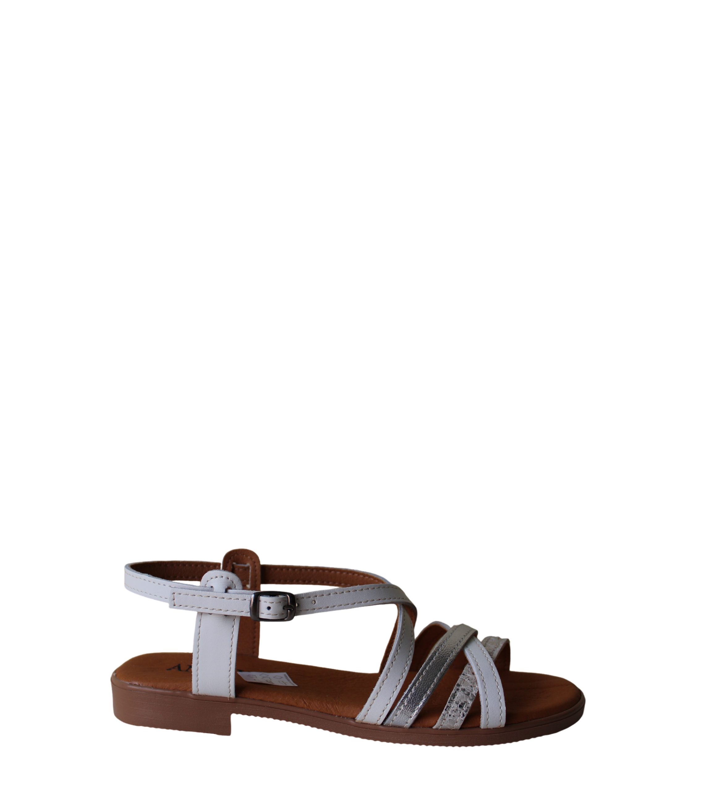 Descrição : Fabridadas em Portugal Sandália Andrya de sola baixa em Pele. Design com tiras cruzadas sobre a gáspea. Fecha com fivela na zona do tornozelo para maior ajuste.