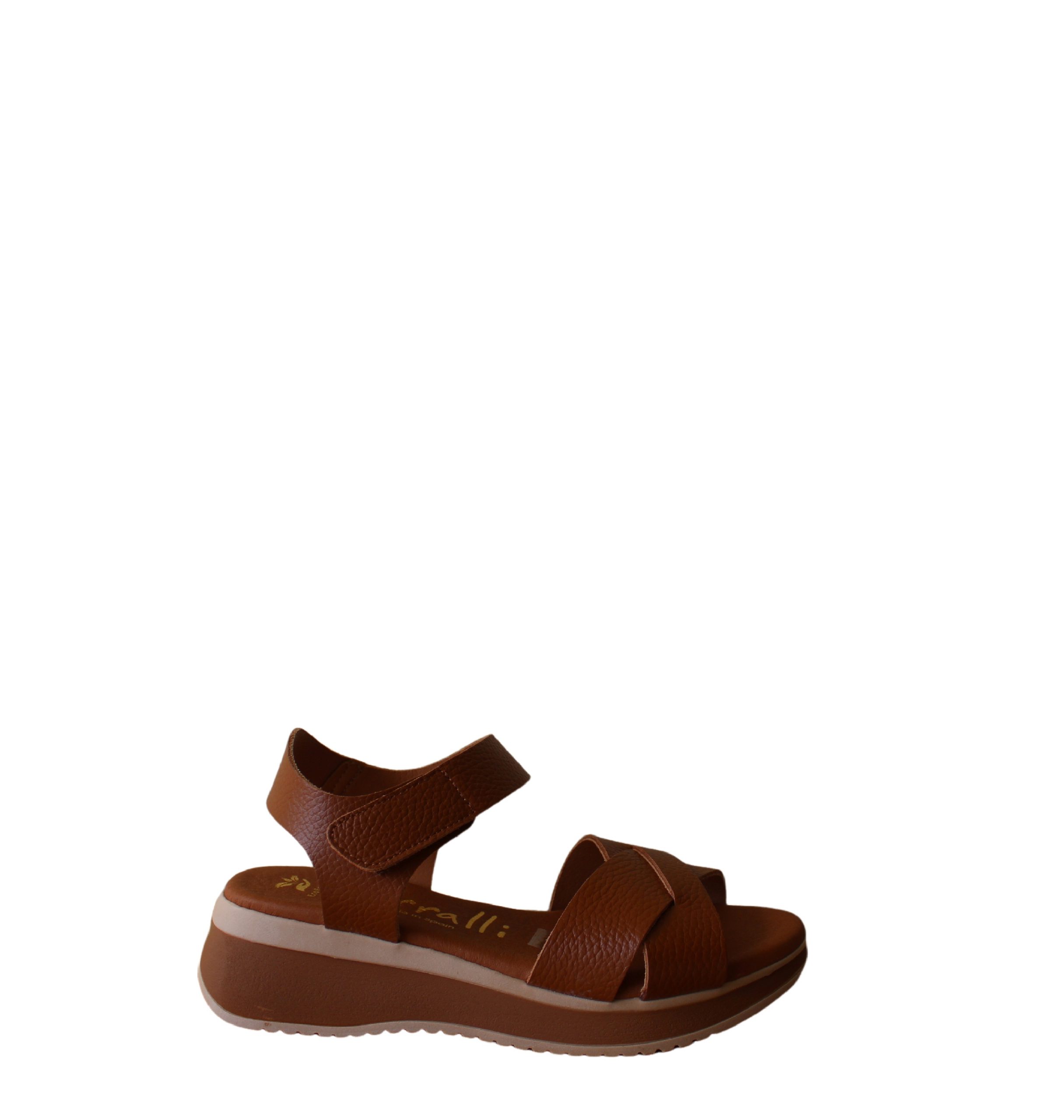 Descrição : Sandália MC de cunha, em pele,com palmilha almofadada. Apresenta duas tiras cruzadas sobre a gáspea, com aberturas laterais. Tira sobre o calcanhar com velcro para maior ajuste.