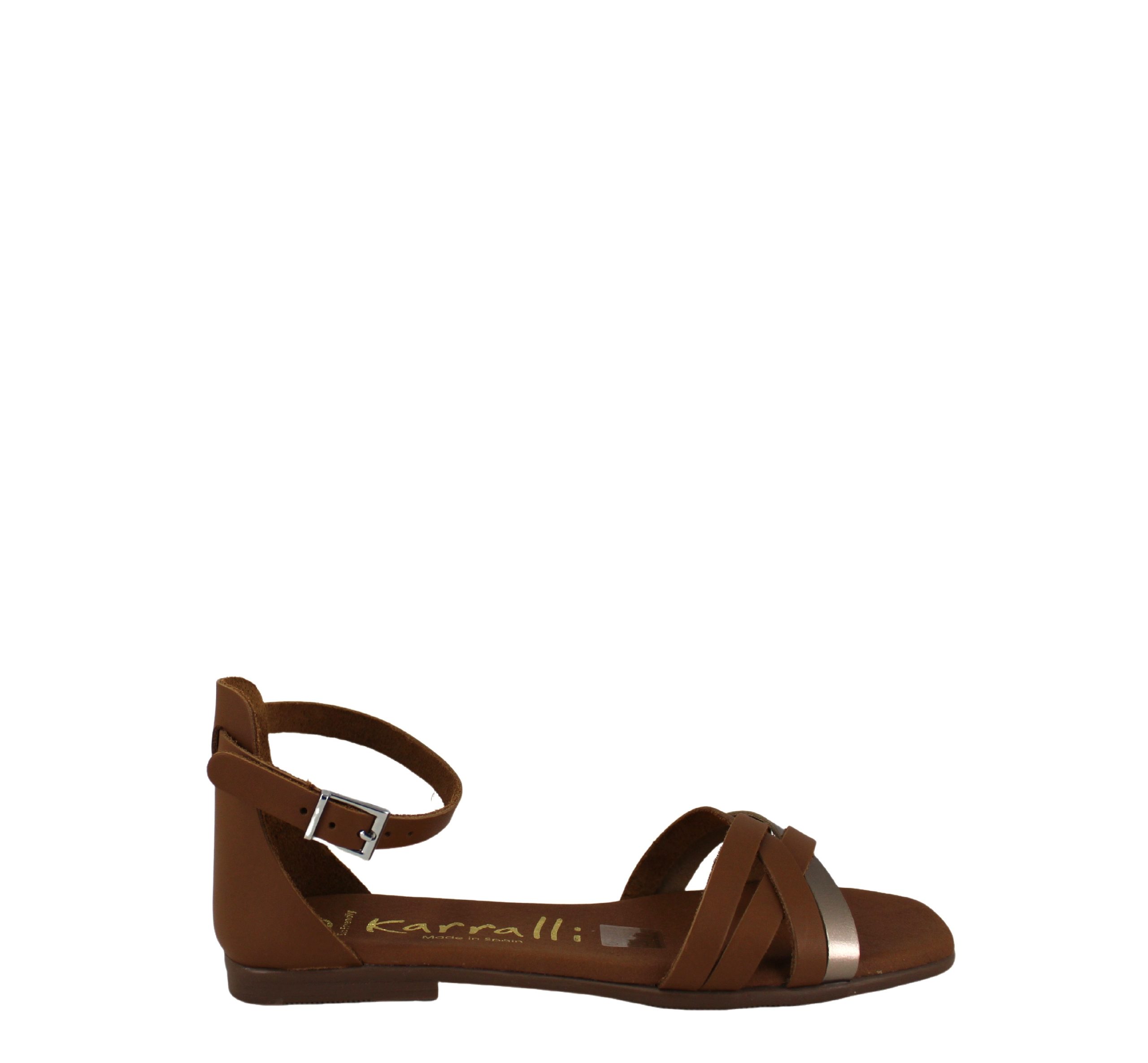 Descrição : Sandália de sola baixa em Pele. Design de calçanhar fechado com tiras cruzadas sobre a gáspea. Fecha com fivela na zona do tornozelo para maior ajuste.
