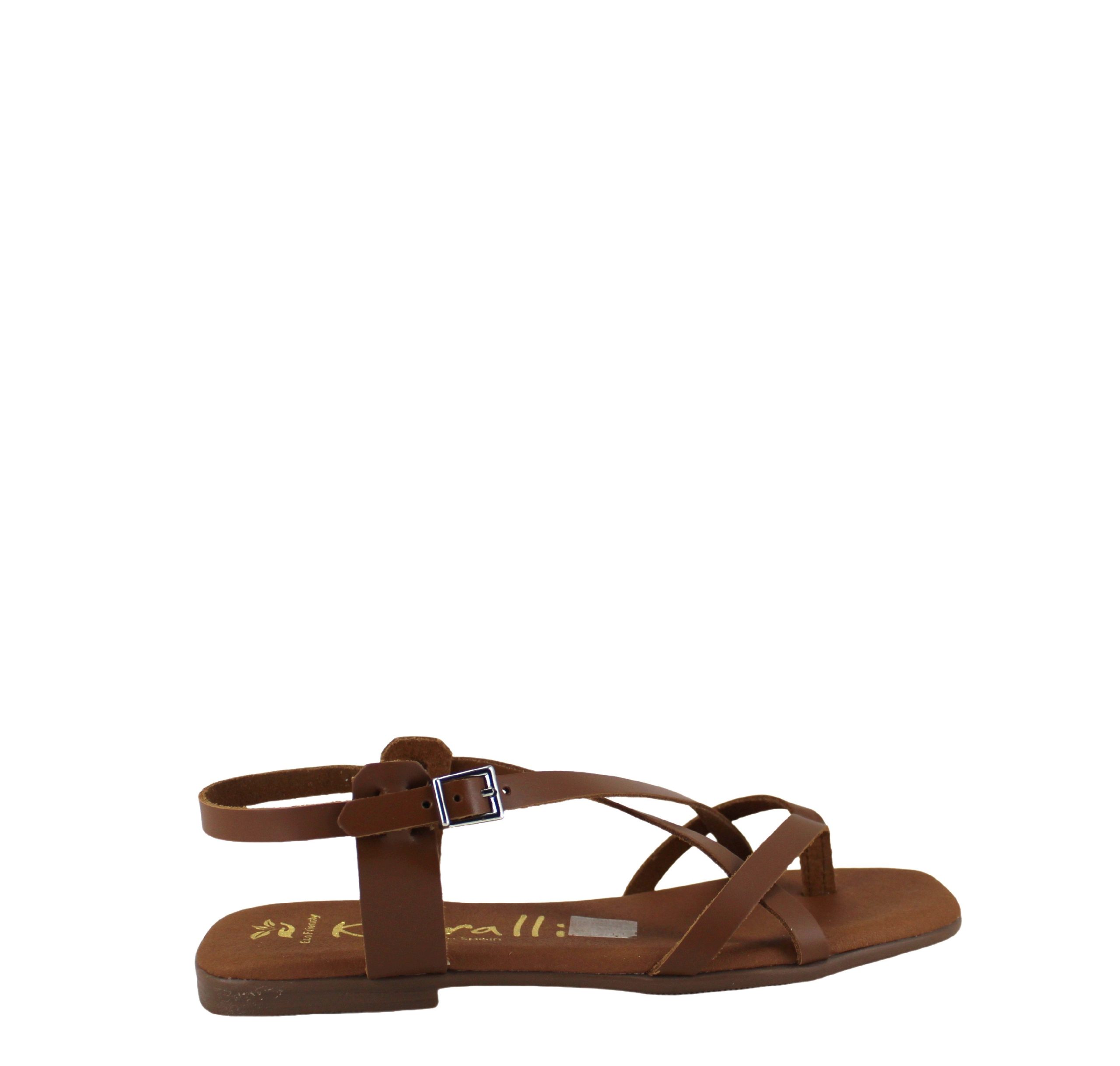 Descrição : Sandália de sola baixa em Pele. Design de dedo com tiras cruzadas sobre a gáspea. Fecha com fivela na zona do tornozelo para maior ajuste.