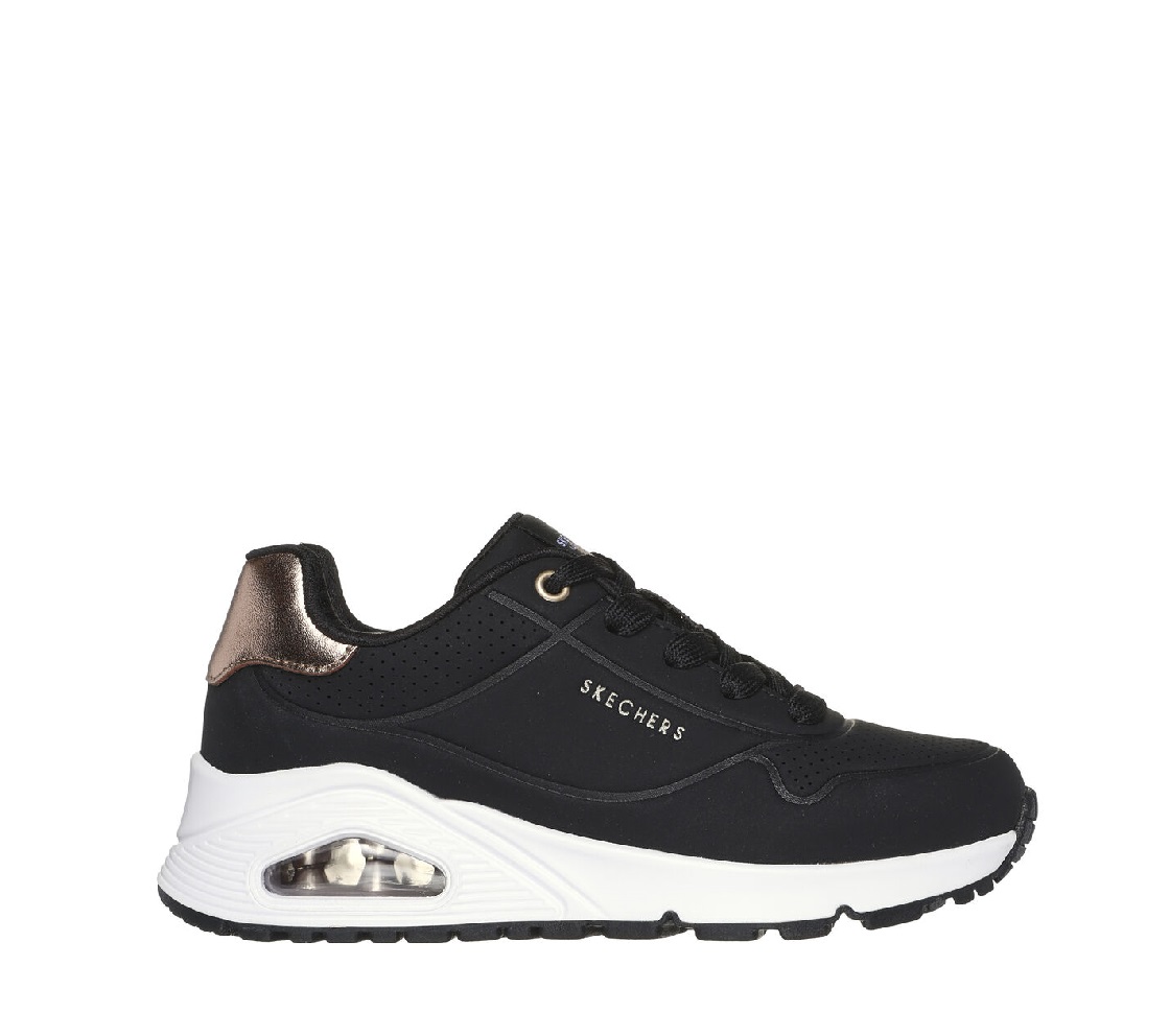 Descrição : Destaca-te no conforto almofadado das sapatilhas Skechers Street™ Uno Gen1 – Shimmer Away. Estas sapatilhas modernas com atacadores têm parte superior em material sintético duraleather e acabamento metálico, palmilhas confortáveis Skechers Air-Cooled Memory Foam® e entressola visívelSkech-Air® com airbag.